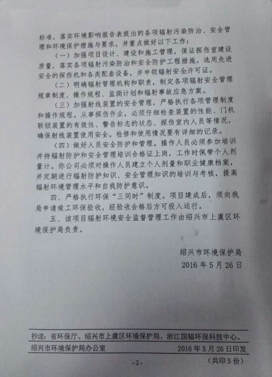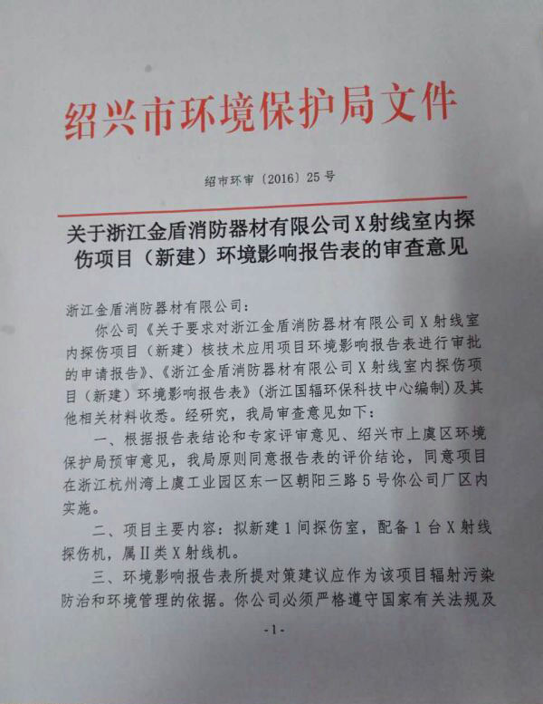 2016年5月26日,绍兴市环境保护局同意我司(浙江金盾消防器材有限公司)X射线室内探伤项目(新建)的环境影响报告。 该项目的报告审批通过后,X射线探伤室将步入正常工作。公司所生产的消防设备进行无损检验后,从而保证产品的质量与生产的安全。